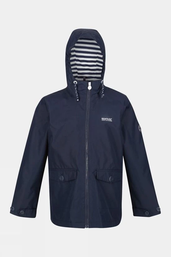 This wet-weather Belladonna Jacket is crafted from waterproof Hydrafort fabric with sealed seams and a DWR (Durable Water Repellent) finish. It features a full front zipper, grown on hood with elastication, two roomy front pockets and adjustable cuffs. Fully lined for comfort. With a rubber Regatta badge on the left sleeve. Layer this stylish little jacket with everything.